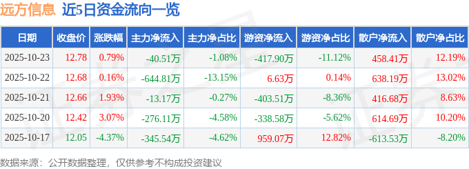 证券之星消息,截至2025年10月23日收盘,远方信息(300306)报收于12.78元,上涨0.79%,换手率1.88%,成交量2.97万手,成交额3759.22万元。