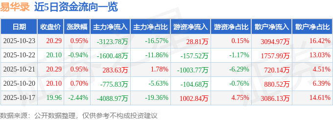 10月23日的资金流向数据方面,主力资金净流出3123.78万元,占总成交额16.57%,游资资金净流入28.81万元,占总成交额0.15%,散户资金净流入3094.97万元,占总成交额16.42%。