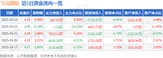 证券之星消息,截至2025年10月23日收盘,飞马国际(002210)报收于4.1元,上涨0.99%,换手率10.47%,成交量278.06万手,成交额11.68亿元。