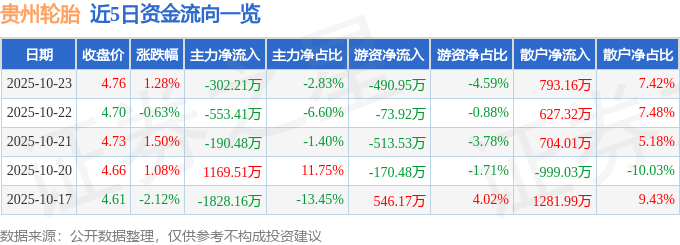 证券之星消息,截至2025年10月23日收盘,贵州轮胎(000589)报收于4.76元,上涨1.28%,换手率1.47%,成交量22.61万手,成交额1.07亿元。
