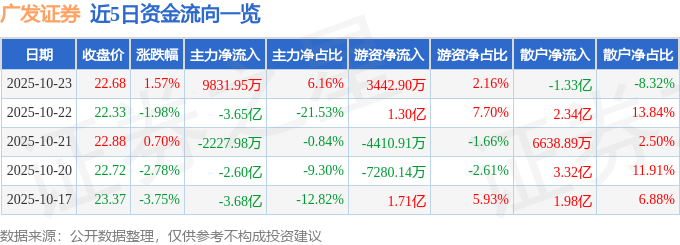证券之星消息,截至2025年10月23日收盘,广发证券(000776)报收于22.68元,上涨1.57%,换手率1.2%,成交量70.87万手,成交额15.95亿元。