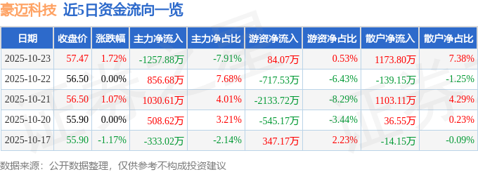 证券之星消息,截至2025年10月23日收盘,豪迈科技(002595)报收于57.47元,上涨1.72%,换手率0.35%,成交量2.79万手,成交额1.59亿元。