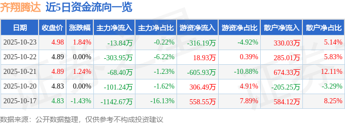 证券之星消息,截至2025年10月23日收盘,齐翔腾达(002408)报收于4.98元,上涨1.84%,换手率0.47%,成交量13.06万手,成交额6426.8万元。