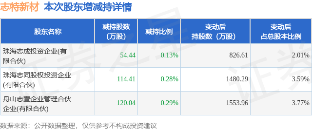 证券之星消息,10月23日志特新材发布公告《志特新材:关于董事减持股份计划实施完成的公告》,其股东珠海志成投资企业(有限合伙)、珠海志同股权投资企业(有限合伙)、舟山志壹企业管理合伙企业(有限合伙)于2025年10月14日至2025年10月22日间合计减持288.89万股,占公司目前总股本的0.7012%,变动期间该股股价下跌0.51%,截止10月22日收盘报11.66元。