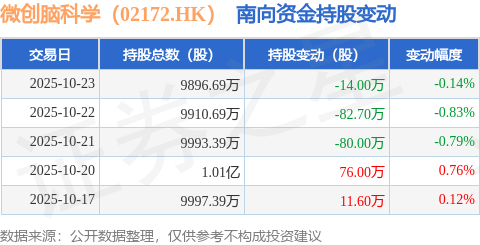 证券之星消息,10月23日南向资金减持14.0万股微创脑科学(02172.HK)。近5个交易日中,获南向资金减持的有3天,累计净减持89.1万股。近20个交易日中,获南向资金增持的有9天,累计净增持175.52万股。截至目前,南向资金持有微创脑科学(02172.HK)9896.69万股,占公司已发行普通股的16.9%。