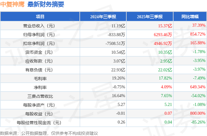 据证券之星公开数据整理,近期中复神鹰(688295)发布2025年三季报。根据财报显示,中复神鹰营收净利润同比双双增长。截至本报告期末,公司营业总收入15.37亿元,同比上升37.39%,归母净利润6293.46万元,同比上升854.72%。按单季度数据看,第三季度营业总收入6.15亿元,同比上升59.23%,第三季度归母净利润5100.48万元,同比上升253.11%。