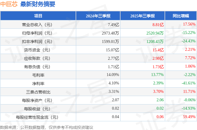 据证券之星公开数据整理,近期中巨芯(688549)发布2025年三季报。截至本报告期末,公司营业总收入8.81亿元,同比上升17.56%,归母净利润2520.94万元,同比下降15.22%。按单季度数据看,第三季度营业总收入3.14亿元,同比上升12.76%,第三季度归母净利润1707.17万元,同比上升152.24%。本报告期中巨芯公司应收账款体量较大,当期应收账款占最新年报归母净利润比达2979.74%。