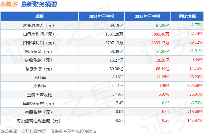 据证券之星公开数据整理,近期多氟多(002407)发布2025年三季报。截至本报告期末,公司营业总收入67.29亿元,同比下降2.75%,归母净利润7805.46万元,同比上升407.74%。按单季度数据看,第三季度营业总收入24.0亿元,同比上升5.18%,第三季度归母净利润2672.44万元,同比上升157.93%。本报告期多氟多盈利能力上升,毛利率同比增幅34.24%,净利率同比增幅147.69%。