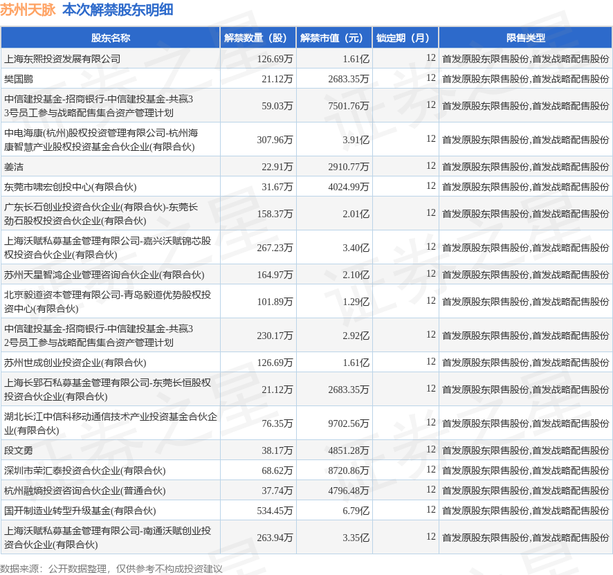 证券之星消息,根据市场公开信息整理,苏州天脉(301626)于10月24日将有2659.1万股限售股份解禁,为公司首发原股东限售股份,首发战略配售股份,占公司总股本22.99%。(本次数据根据历史公告整理得出,实际情况以上市公司最新公告为准)最近一年内,该股累计解禁403.57万股,占总股本的3.49%。本次解禁后,公司还有6306.1万股限售股份,占总股本54.51%。具体如下图所示: