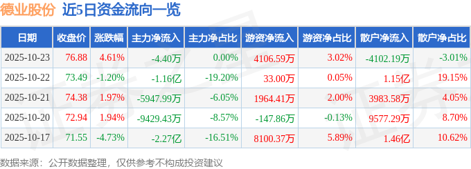 证券之星消息,截至2025年10月23日收盘,德业股份(605117)报收于76.88元,上涨4.61%,换手率1.99%,成交量18.09万手,成交额13.61亿元。