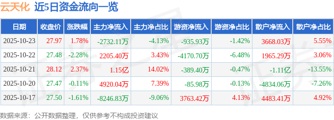 10月23日的资金流向数据方面,主力资金净流出2732.11万元,占总成交额4.13%,游资资金净流出935.93万元,占总成交额1.42%,散户资金净流入3668.03万元,占总成交额5.55%。