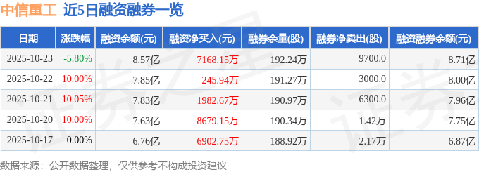证券之星消息,截至2025年10月23日收盘,中信重工(601608)报收于7.15元,下跌5.8%,换手率11.83%,成交量538.12万手,成交额41.21亿元。