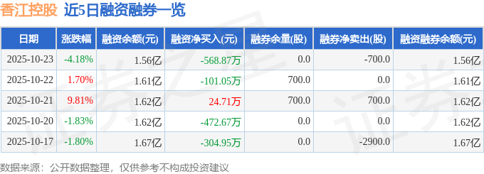 香江控股融资融券信息显示,融资方面,当日融资买入2610.35万元,融资偿还3179.22万元,融资净偿还568.87万元。融券方面,融券卖出0.0股,融券偿还700.0股,融券余量0.0股,融券余额0.0万元。融资融券余额1.56亿元。