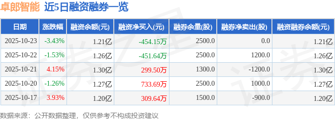 卓郎智能融资融券信息显示,融资方面,当日融资买入1210.71万元,融资偿还1664.86万元,融资净偿还454.15万元。融券方面,融券卖出0.0股,融券偿还0.0股,融券余量2500.0股,融券余额0.78万元。融资融券余额1.21亿元。