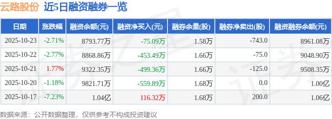 云路股份融资融券信息显示,融资方面,当日融资买入1342.8万元,融资偿还1417.89万元,融资净偿还75.09万元。融券方面,融券卖出500.0股,融券偿还1243.0股,融券余量1.58万股,融券余额167.32万元。融资融券余额8961.08万元。