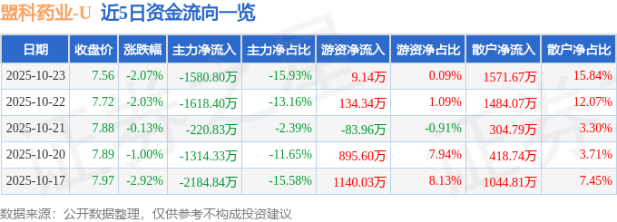 证券之星消息,截至2025年10月23日收盘,盟科药业(688373)报收于7.56元,下跌2.07%,换手率2.51%,成交量13.21万手,成交额9922.27万元。