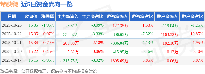 证券之星消息,截至2025年10月23日收盘,希荻微(688173)报收于15.05元,下跌1.95%,换手率1.57%,成交量6.41万手,成交额9539.46万元。