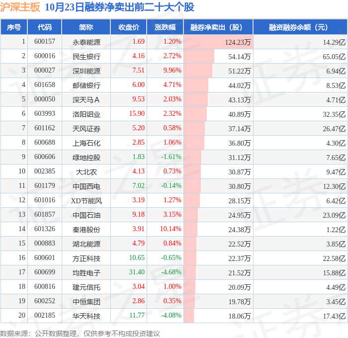 沪深主板融券净卖出前三分别为:永泰能源(600157)融券净卖出124.23万股、民生银行(600016)融券净卖出54.14万股、深圳能源(000027)融券净卖出51.22万股,前20具体见下表: