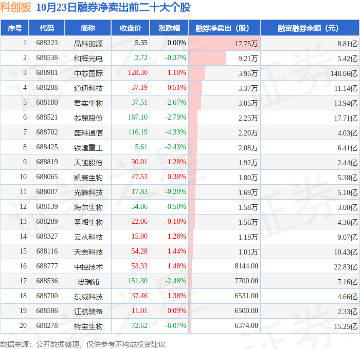 科创板融券净卖出前三分别为:晶科能源(688223)融券净卖出17.75万股、和辉光电(688538)融券净卖出9.21万股、中芯国际(688981)融券净卖出3.95万股,前20具体见下表: