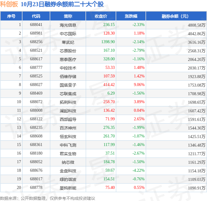 科创板融券余额前三分别为:海光信息(688041)融券余额4808.58万元、中芯国际(688981)融券余额4042.86万元、寒武纪(688256)融券余额3616.16万元,前20具体见下表: