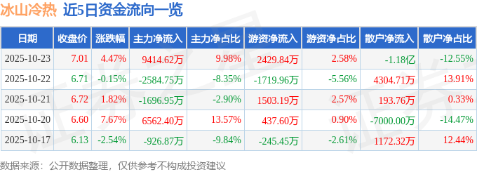 证券之星消息,截至2025年10月23日收盘,冰山冷热(000530)报收于7.01元,上涨4.47%,换手率22.75%,成交量136.52万手,成交额9.44亿元。