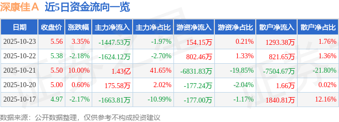 证券之星消息,截至2025年10月23日收盘,深康佳A(000016)报收于5.56元,上涨3.35%,换手率8.21%,成交量131.06万手,成交额7.36亿元。