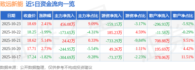 证券之星消息,截至2025年10月23日收盘,致远新能(300985)报收于18.69元,上涨2.41%,换手率1.46%,成交量2.72万手,成交额5017.95万元。
