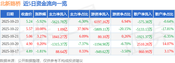 证券之星消息,截至2025年10月23日收盘,北新路桥(002307)报收于5.24元,下跌5.92%,换手率13.25%,成交量168.02万手,成交额8.93亿元。