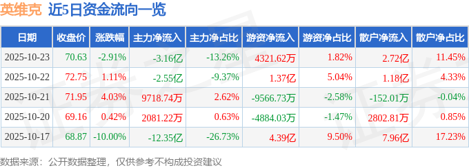 证券之星消息,截至2025年10月23日收盘,英维克(002837)报收于70.63元,下跌2.91%,换手率3.99%,成交量33.94万手,成交额23.81亿元。