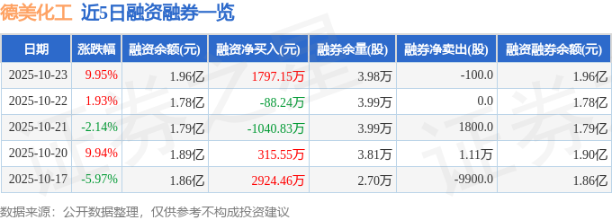 证券之星消息,截至2025年10月23日收盘,德美化工(002054)报收于8.73元,上涨9.95%,涨停,换手率21.74%,成交量83.56万手,成交额6.92亿元。
