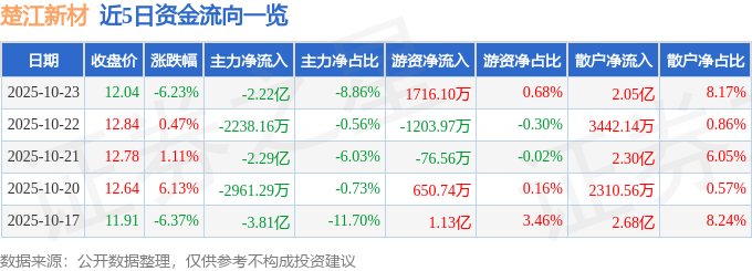 证券之星消息,截至2025年10月23日收盘,楚江新材(002171)报收于12.04元,下跌6.23%,换手率12.66%,成交量204.28万手,成交额25.06亿元。