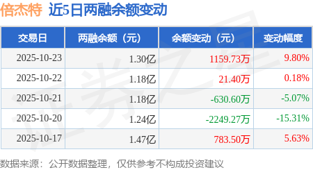 证券之星消息,10月23日,倍杰特(300774)融资买入2942.88万元,融资偿还1783.15万元,融资净买入1159.73万元,融资余额1.3亿元,近20个交易日中有13个交易日出现融资净买入。