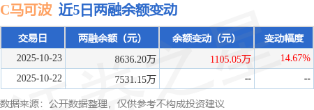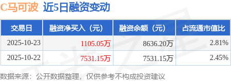证券之星消息,10月23日,C马可波(001386)融资买入6593.38万元,融资偿还5488.33万元,融资净买入1105.05万元,融资余额8636.2万元。