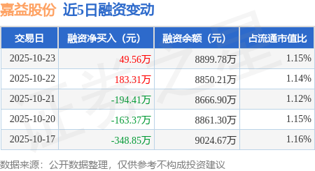 证券之星消息,10月23日,嘉益股份(301004)融资买入292.52万元,融资偿还242.95万元,融资净买入49.56万元,融资余额8899.78万元。