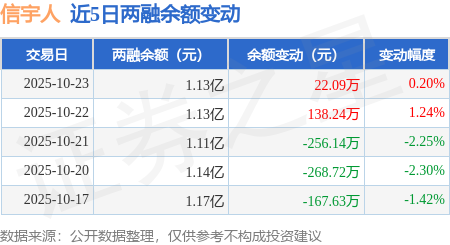证券之星消息,10月23日,信宇人(688573)融资买入346.47万元,融资偿还324.38万元,融资净买入22.09万元,融资余额1.13亿元。
