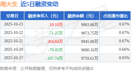 证券之星消息,10月23日,周大生(002867)融资买入527.85万元,融资偿还517.75万元,融资净买入10.1万元,融资余额9883.86万元。