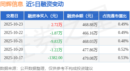 证券之星消息,10月23日,同辉信息(920090)融资买入23.93万元,融资偿还21.21万元,融资净买入2.72万元,融资余额468.88万元。