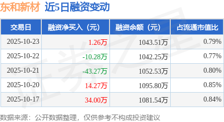 证券之星消息,10月23日,东和新材(920792)融资买入130.95万元,融资偿还129.69万元,融资净买入1.26万元,融资余额1043.51万元。