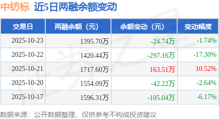 证券之星消息,10月23日,中纺标(920122)融资买入93.83万元,融资偿还118.57万元,融资净卖出24.74万元,融资余额1395.7万元。
