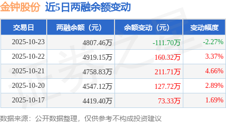 证券之星消息,10月23日,金钟股份(301133)融资买入626.93万元,融资偿还738.63万元,融资净卖出111.7万元,融资余额4807.46万元。