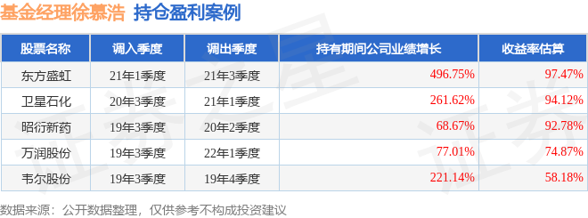 徐慕浩管理的泰信竞争优选混合基金在21年1季度买入东方盛虹,在持有2个季度后在21年3季度卖出。持有期间的估算收益率为97.47%,持有期间东方盛虹在2020年到2021年的年报归属净利润增幅达496.75%。