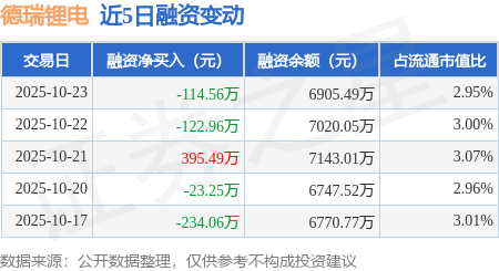 证券之星消息,10月23日,德瑞锂电(920523)融资买入131.87万元,融资偿还246.43万元,融资净卖出114.56万元,融资余额6905.49万元。