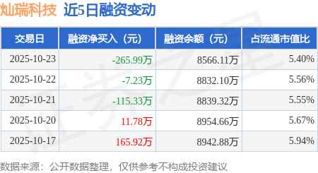 证券之星消息,10月23日,灿瑞科技(688061)融资买入183.73万元,融资偿还449.72万元,融资净卖出265.99万元,融资余额8566.11万元。