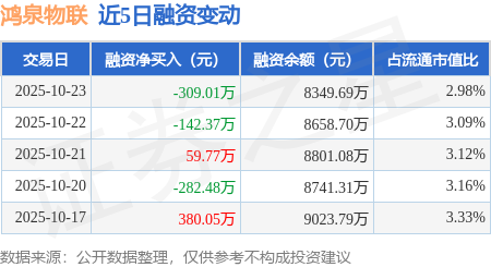 证券之星消息,10月23日,鸿泉物联(688288)融资买入229.73万元,融资偿还538.74万元,融资净卖出309.01万元,融资余额8349.69万元。