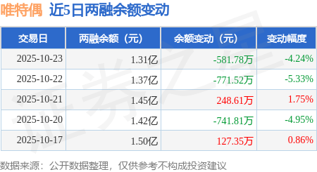 证券之星消息,10月23日,唯特偶(301319)融资买入803.27万元,融资偿还1385.06万元,融资净卖出581.78万元,融资余额1.31亿元。