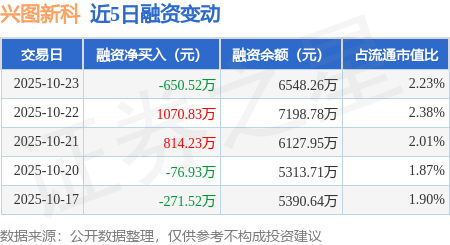 证券之星消息,10月23日,兴图新科(688081)融资买入616.32万元,融资偿还1266.84万元,融资净卖出650.52万元,融资余额6548.26万元。