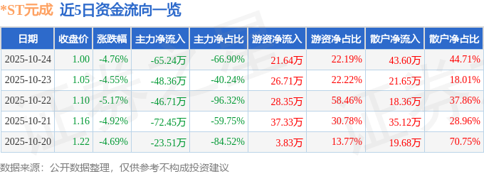 证券之星消息,截至2025年10月24日收盘,*ST元成(603388)报收于1.0元,下跌4.76%,换手率0.3%,成交量9752.0手,成交额97.52万元。