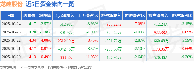 证券之星消息,截至2025年10月24日收盘,龙建股份(600853)报收于4.17元,下跌2.57%,换手率3.08%,成交量31.14万手,成交额1.31亿元。