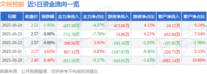 证券之星消息,截至2025年10月24日收盘,文投控股(600715)报收于2.52元,下跌1.95%,换手率1.47%,成交量39.23万手,成交额9998.81万元。
