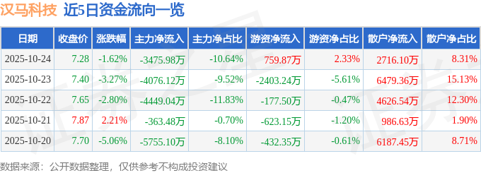 证券之星消息,截至2025年10月24日收盘,汉马科技(600375)报收于7.28元,下跌1.62%,换手率4.08%,成交量44.35万手,成交额3.27亿元。